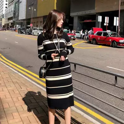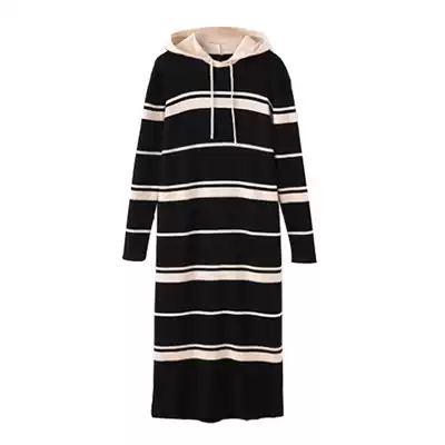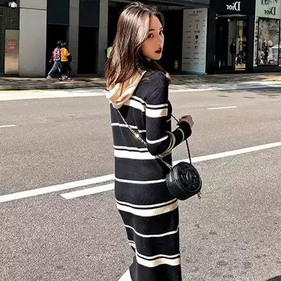 Autumn and winter hooded knit dress with coat over knee striped sweater with long skirt in winter lazy wind sweater skirt