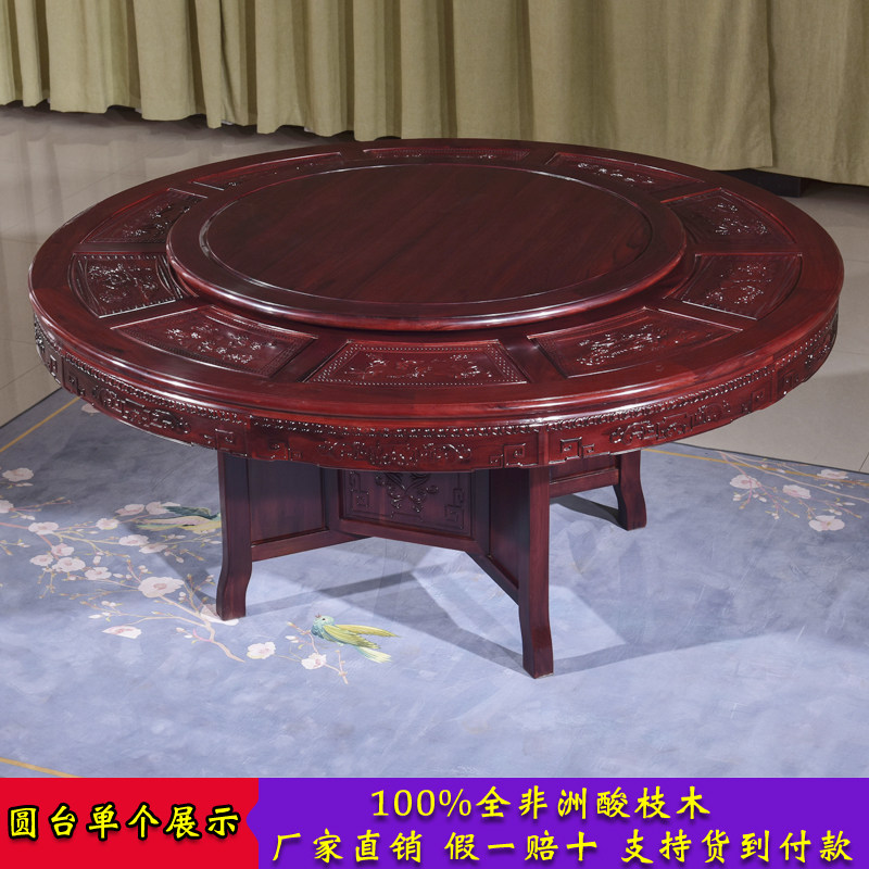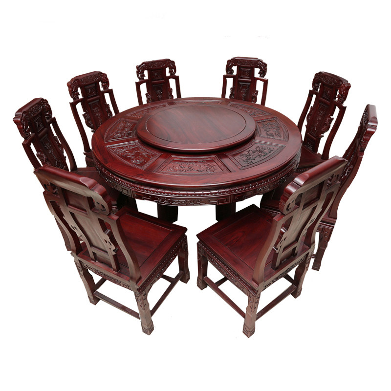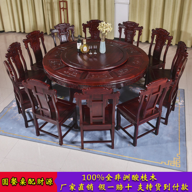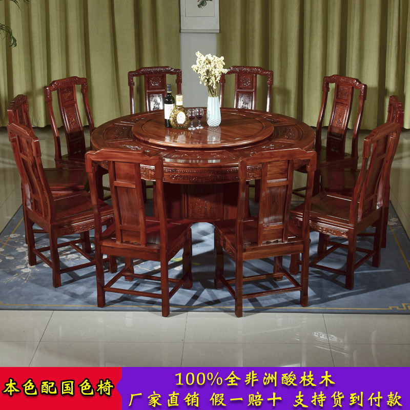 Mahogany round dining table African sour branch wood dining table chair combination solid wood carved Chinese type large round table furniture