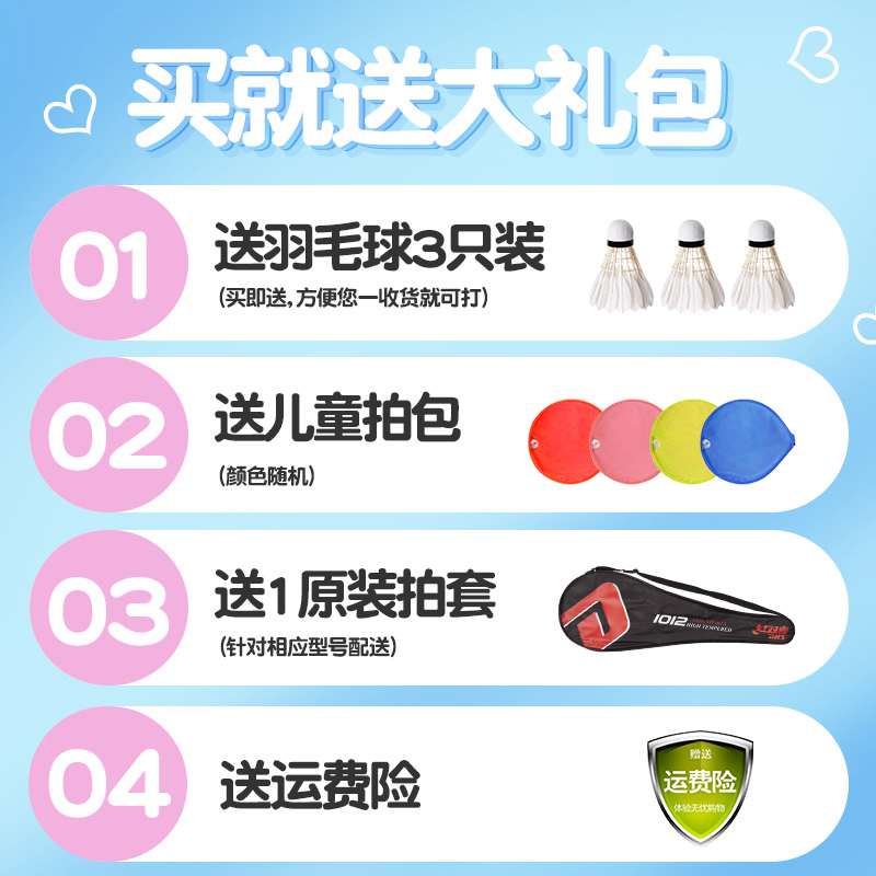 4 packs (209 red + blue) + (E-DT101 blue two) 3 badmintons and 2 racket sets