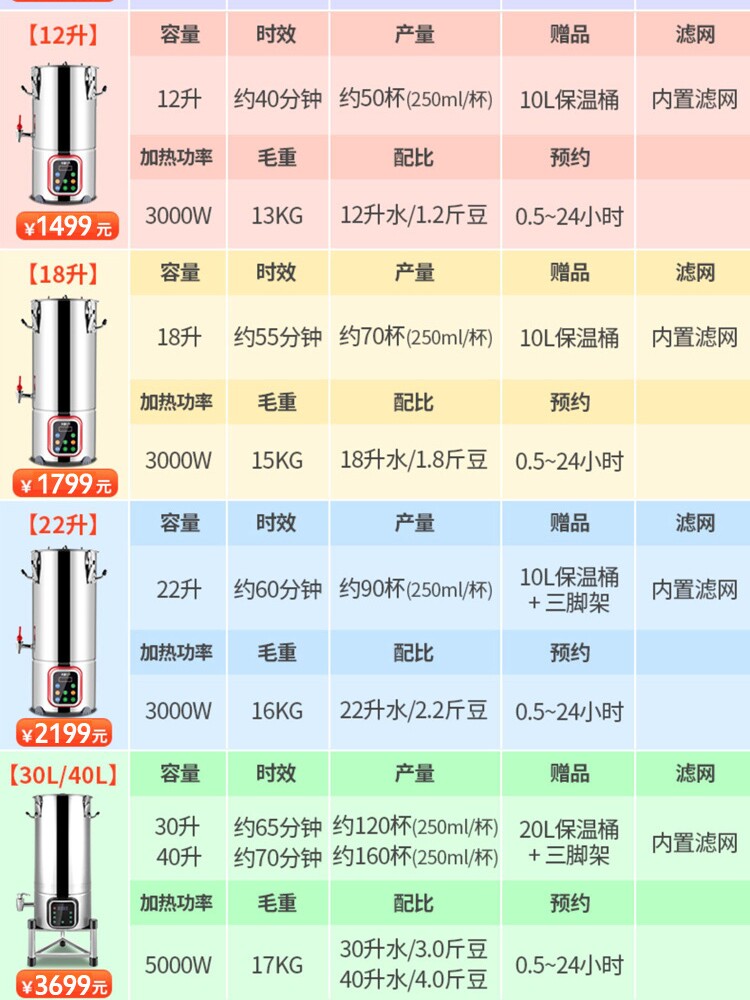 11L built-in filter + reservation + can be loaded with 22 kg of water 12L built-in filter + reservation + can be loaded with 24 kg of water 18L built-in filter + reservation + can be installed with 36 kg of water 22L built-in filter + reservation + can be loaded with 44 kg of water 30L built-in filter + reservation + can be loaded with 60 kg of water 40L built-in filter + reservation + can be loaded with 80 kg of water 22L soy milk tofu brain machine can be made 20 kg of tofu brain 18L soy milk tofu brain machine can be made 20 kg of tofu brain