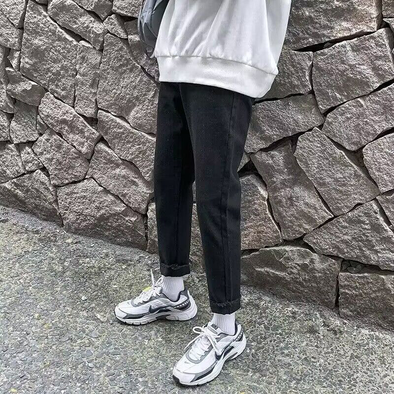 Winter plus velvet net red pants bf style Korean version of the trendy jeans men's teenagers raw edge loose nine-point pants tide brand