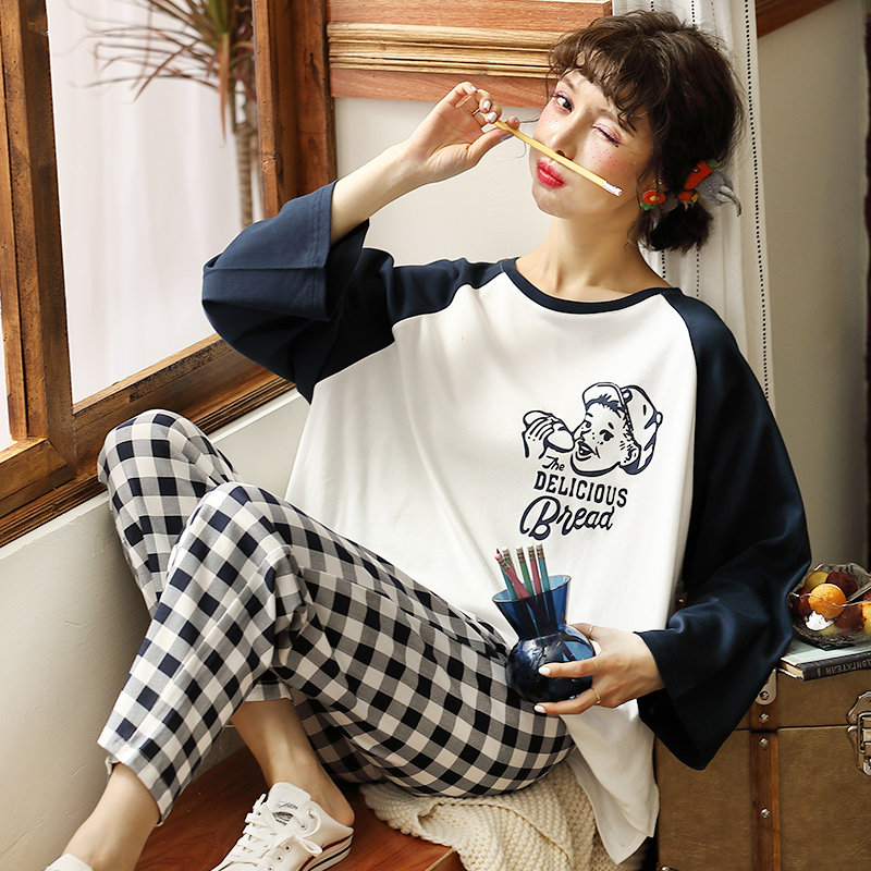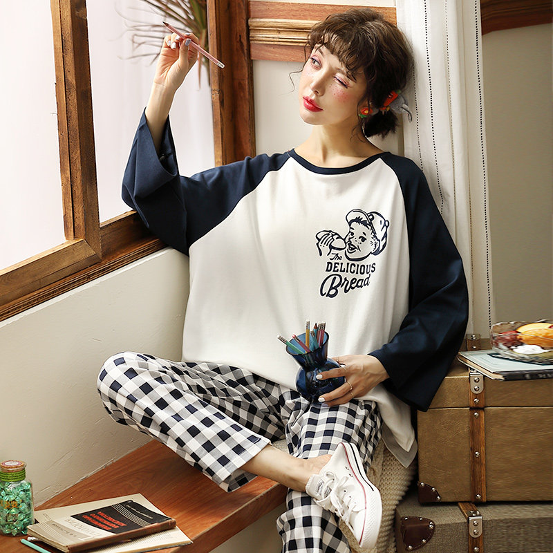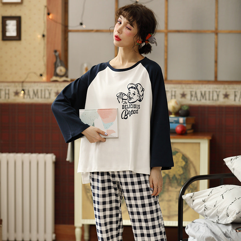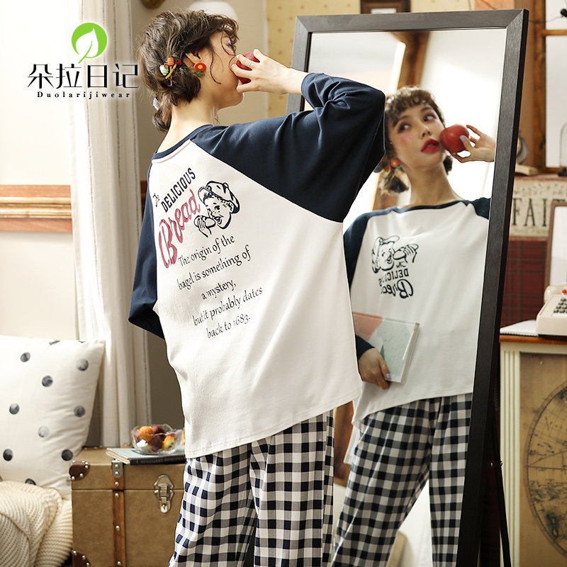 Cute long sleeve autumn winter pyjamas women's pure cotton suit Spring and autumn season Korean version of grid student headsets full cotton home clothes