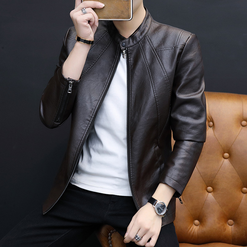 Leather men's fashion jacket Slim short stand collar spring and autumn Korean version of the trend Haining small leather men's jacket jacket