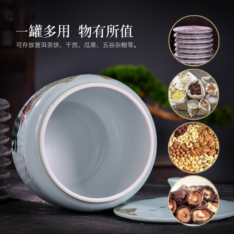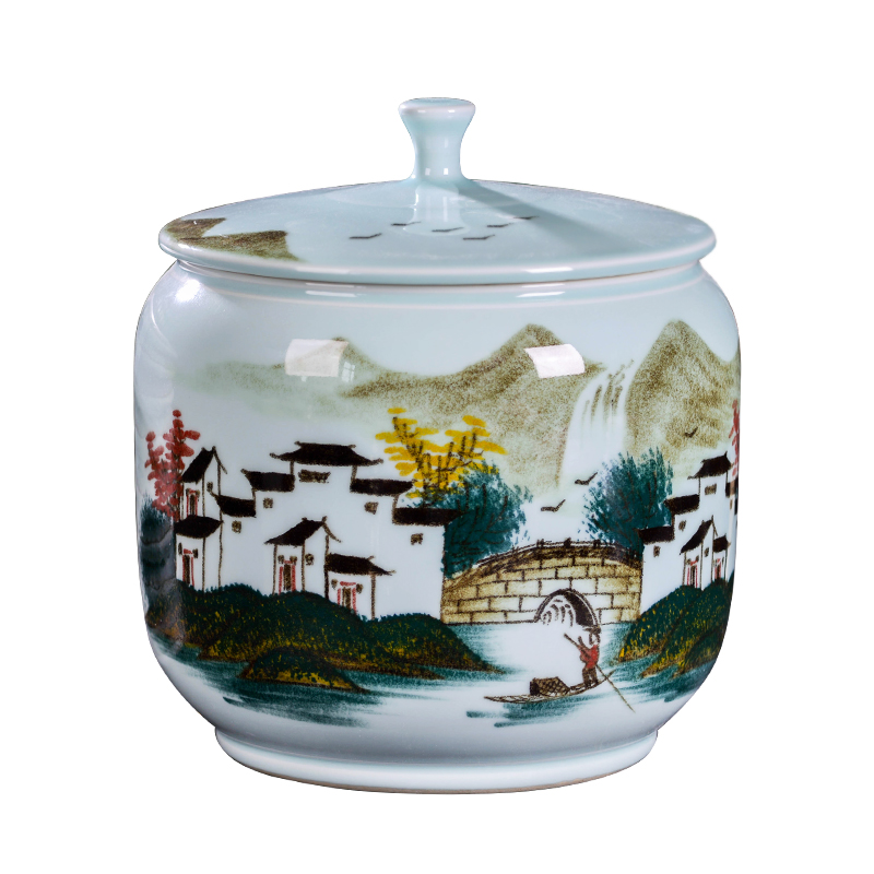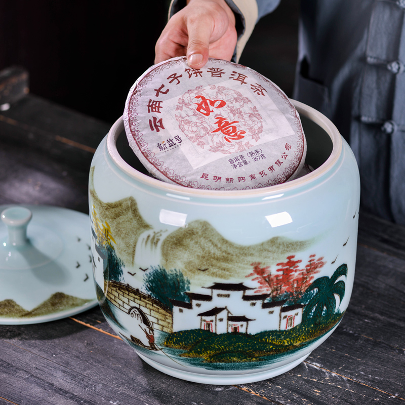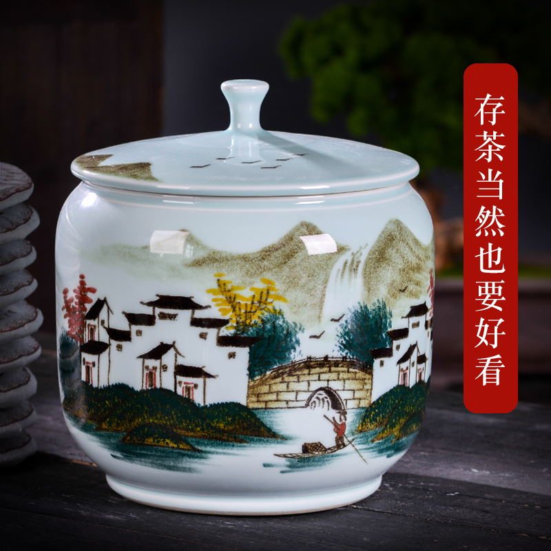 Jingdezhen Ceramics Retro Hand-painted Landscape Tea Leaf Jar Storage Tank Pu-erh Tea Cake Wake-up Jar Seal Tank Big Tea Vat