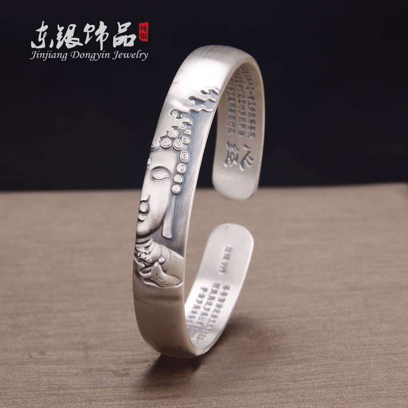 Vintage 999 Sterling Silver Anemone Wudao Half Buddha Bo Ruo Bo Ruo Honey Heart Sutra Opening Elegant relief solid silver bracelet