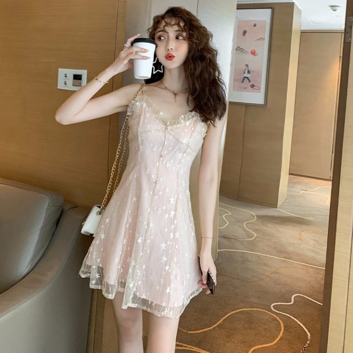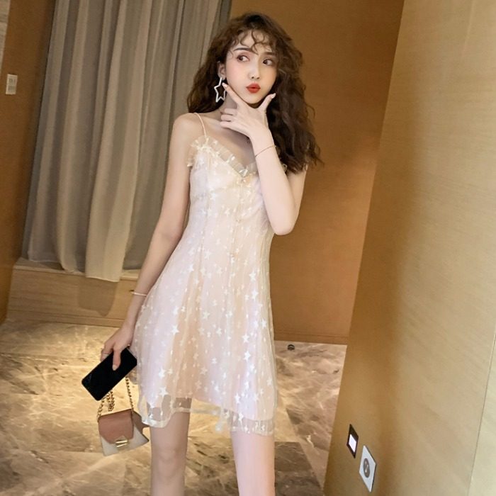 Goeger's Summer Net Red Sexy Nightclub Goddess Harness Low Chest Lace V Neckline Red Stars for Body Dress