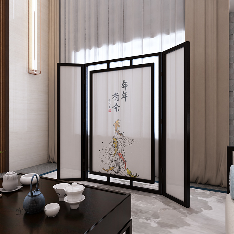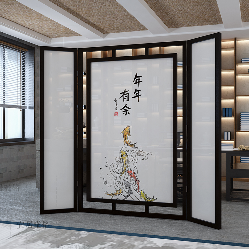Chinese style screen partition living room bedroom minimalist modern folding mobile solid wood left and right hollowed-out seat screen with fish year after year