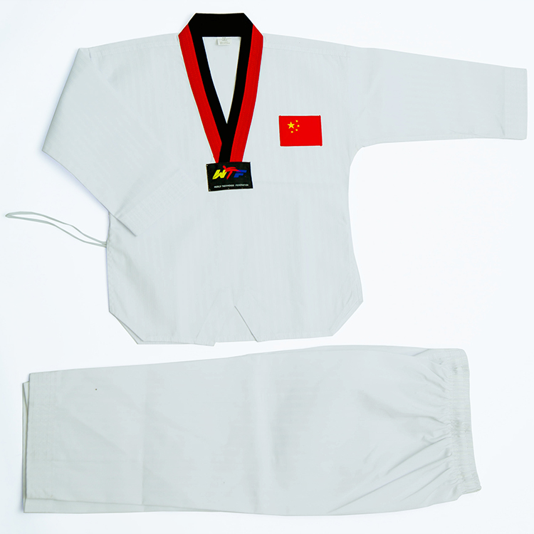 White card suit (polyester-cotton) White three-stripe suit (polyester-cotton) White large grid suit (polyester-cotton) White cotton suit (cotton) Poomsae KTD white top red pants Poomsae KTD white top