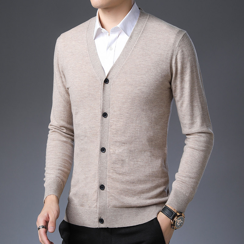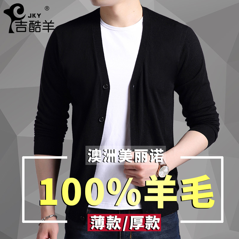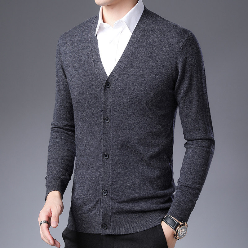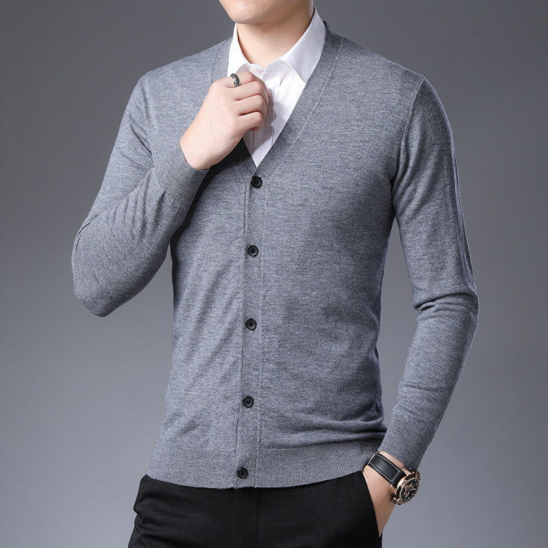 Spring-autumn season men's pure wool cardio-hoodie V collar youth trend Korean version jacket men's clothing sweaters pure color needlework-Taobao