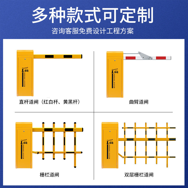 Straight pole road gate (excluding pole) Straight pole gate (including straight pole within 6 meters) Vertical word screen two-line character (recognition machine) New color character four horizontal screen (recognition machine) Anti-smashing DC brushless road gate (including straight pole within 6 meters) Single channel (fence gate *1 + two-line license plate recognition *2) Single channel (straight pole gate *1 + two-line license plate recognition *2) Dual channel (straight pole gate *1 + two-line license plate recognition *2) Dual channel (fence pole gate *1 + two-line license plate recognition *2) Integrated lane gate 1 Four-line screen license plate recognition (single) Two-row screen license plate recognition (single) Four-line license plate recognition (1 fence gate (including fence pole within 4 meters) Fence gate (including 6 meter fence) Four-line license plate recognition (2 vehicle detector 1 (single) Customized by function Other styles customization (for details, consult customer service)