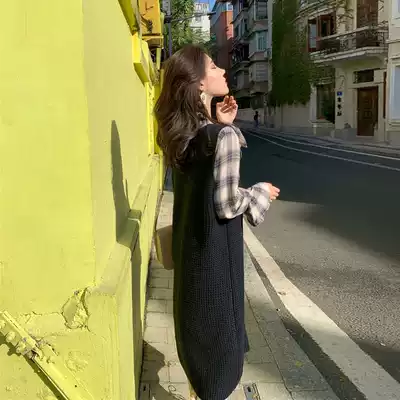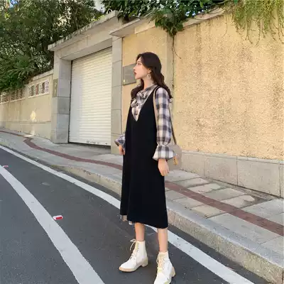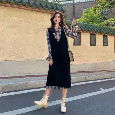 HSW early autumn lazy style plaid shirt skirt sweater vest suspender skirt two-piece fashion temperament set
