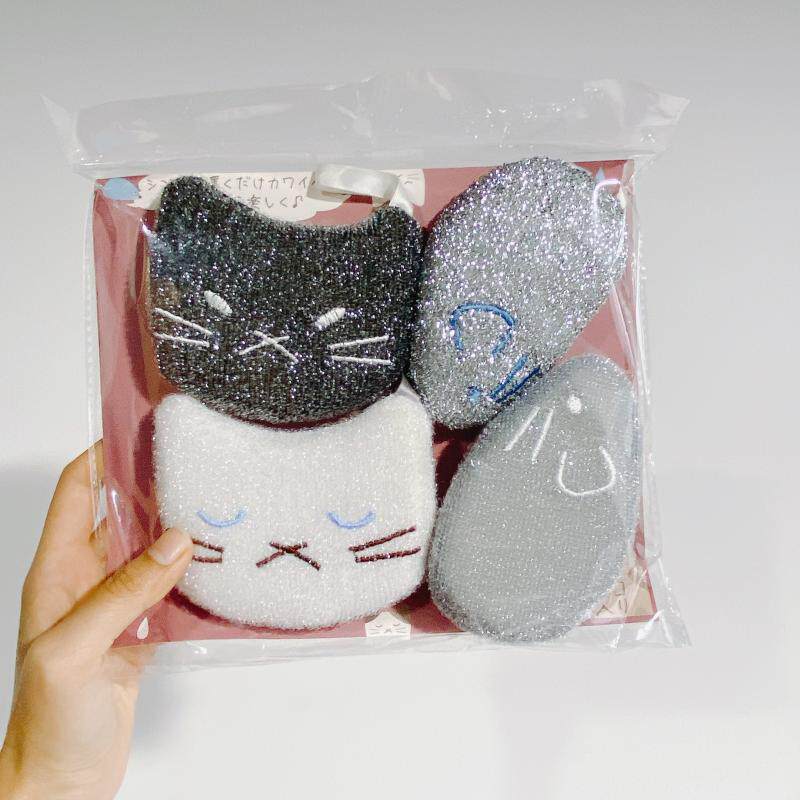 (4 pieces) cute kitty fights cartoon dishwashing sponge scrub and clean cloth decontamination pan brush non-stick pan hanging rope-Taobao