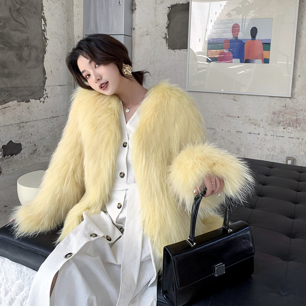 Double Warm 2021 Autumn Winter Raccoon Dog Fur Bifacial Weave Leather Grass Women's Dress Jacket Mid-Length V collar Slim Coat