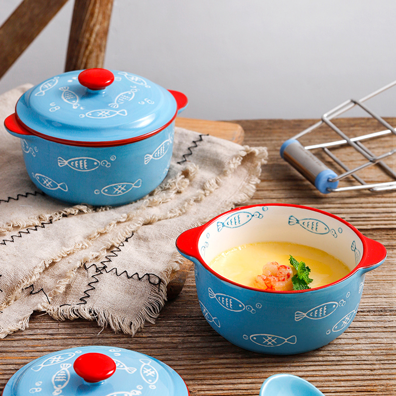 MAR March | Twin Ear Bowl with lid Home Baby Steamed Egg Spoon Bowl Baby Coveting Bowl Stew Ceramic Cute Bowl