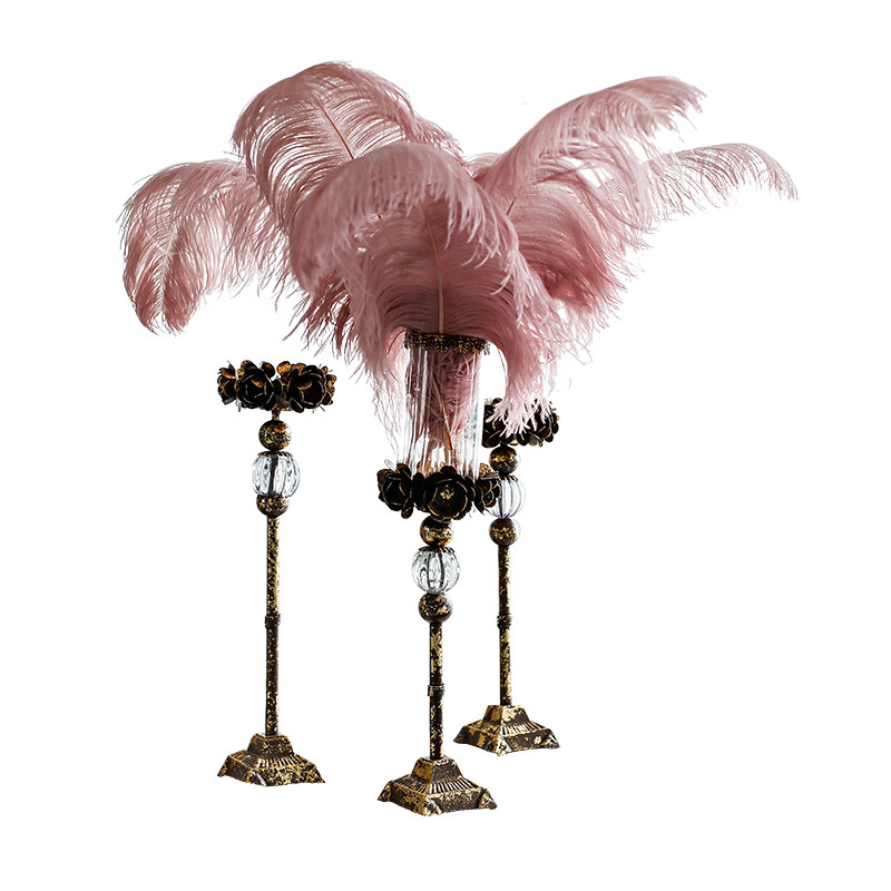 Small candlestick with glass shade Medium candlestick with glass shade Large candlestick with glass shade One white feather 60cm One pink feather 60cm One purple feather 60cm Golden leaf candlestick