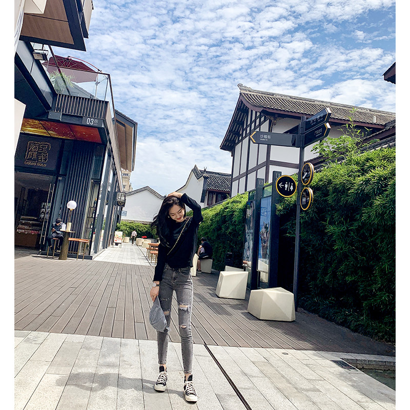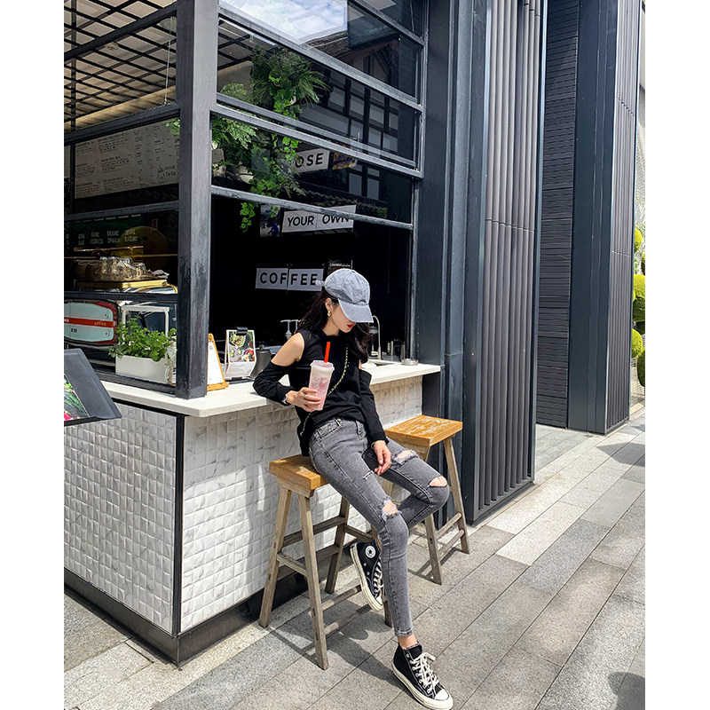 Tobacco grey Broken Cave Jeans Woman 90% Slim Fit 2022 Spring Autumn New Korean Version High Waist Slim Fit Tight Slim Fit Pants