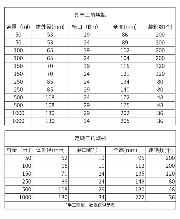 In case of other calibre required Remarks or contact with plug 50ml 100ml 150ml 19 Number of openings 100ml 19 24 Number of openings 250ml 24 Number of openings 250ml 24 Number of openings