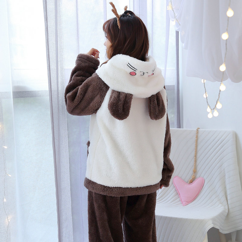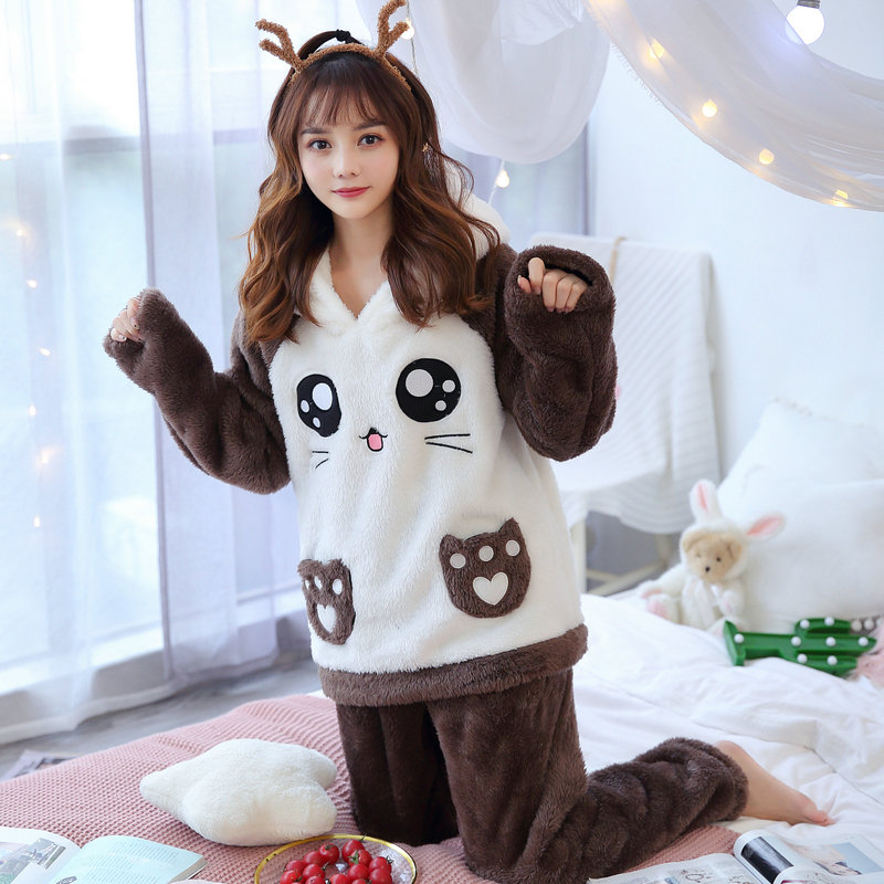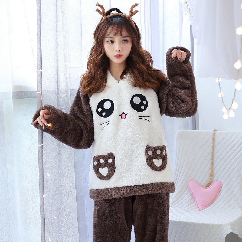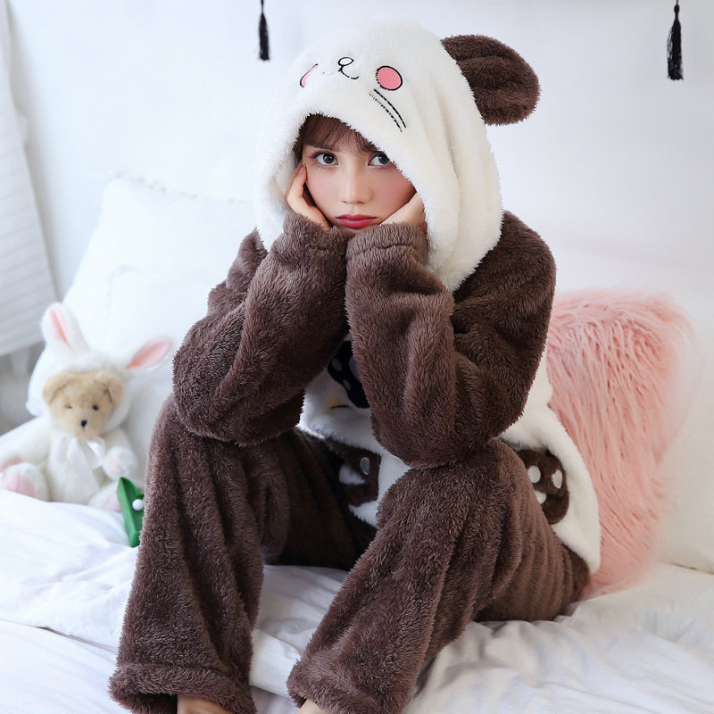 Sleepwear Woman Autumn Winter Cute Cute Little Bear Even Cap Thickened Coral Suede Big Size Easy to wear outside wearing home jacket