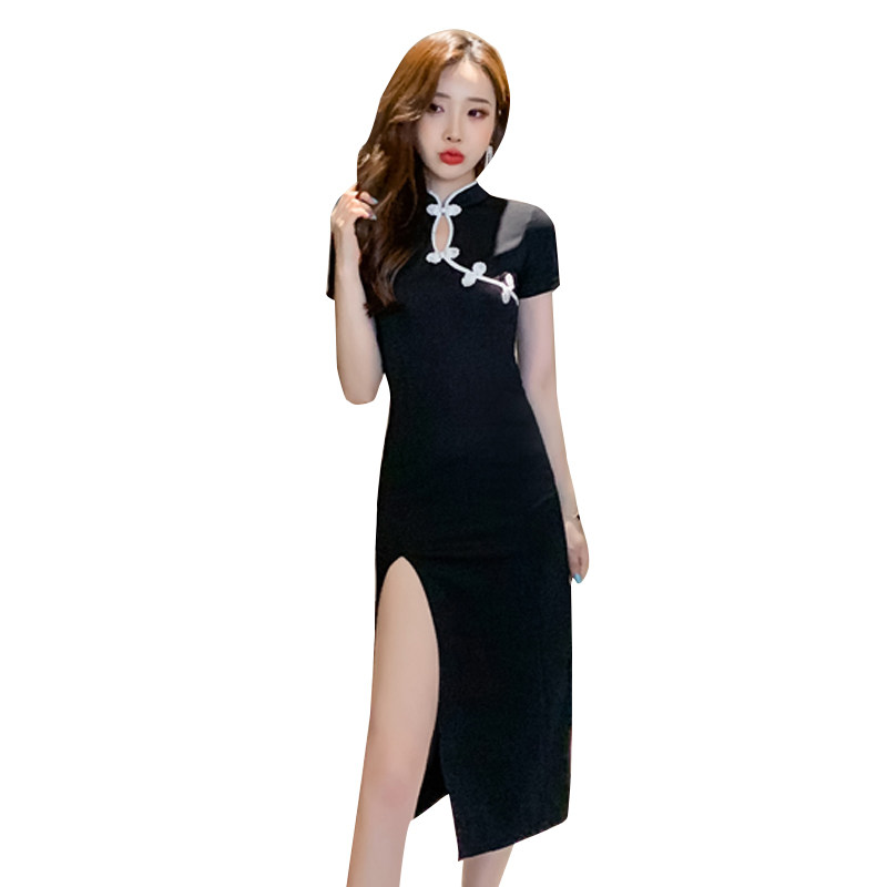 Gaggers Summer name Yuanyuan Sexy Goddess Retro Slim Fit Slim Middle Long Skirt Improved Qipao Open Fork Foreign Dress