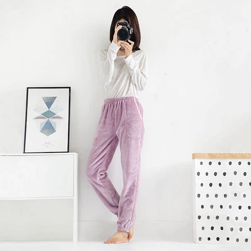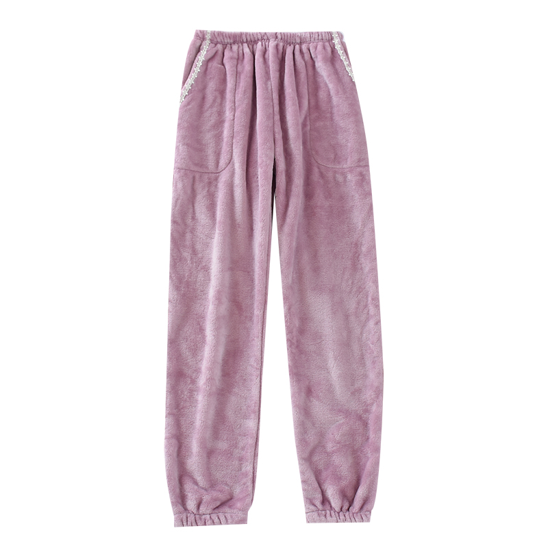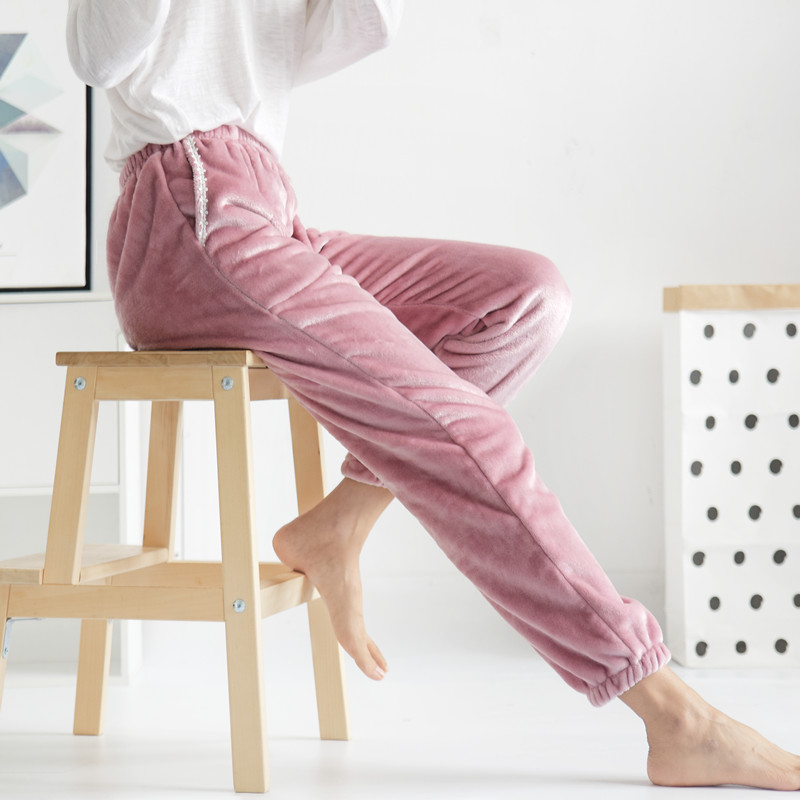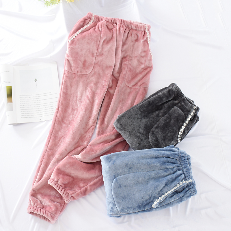 Autumn and winter pajamas women's thick flannel small feet close home pants large size solid color coral velvet warm drawstring pants