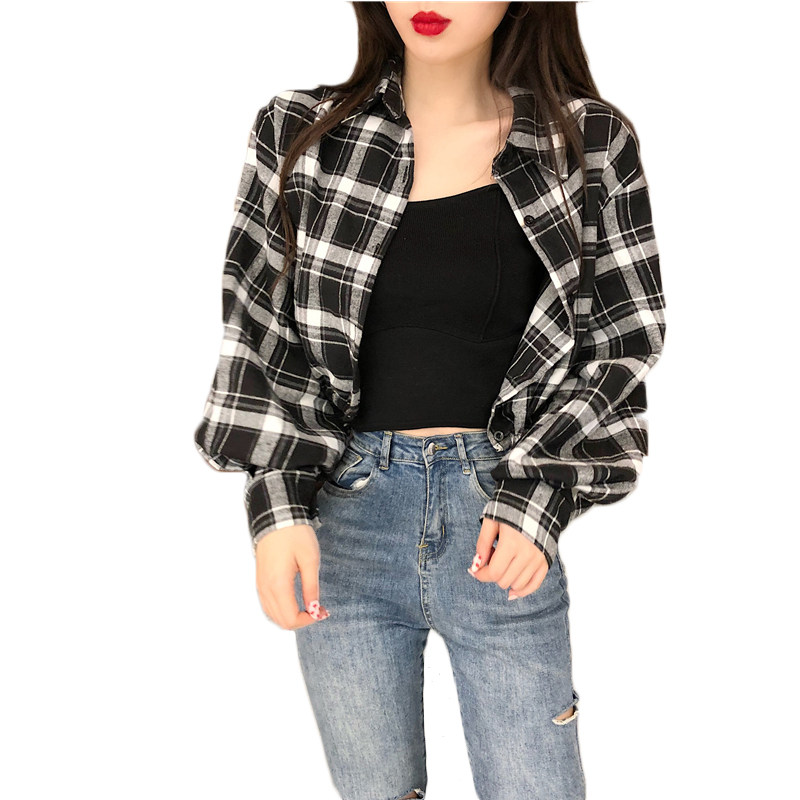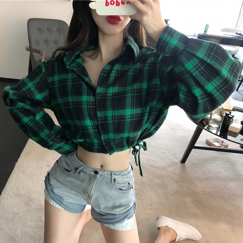 Hong Kong style drawstring long-sleeved plaid shirt autumn new vintage loose short single breasted shirt umbilical top women