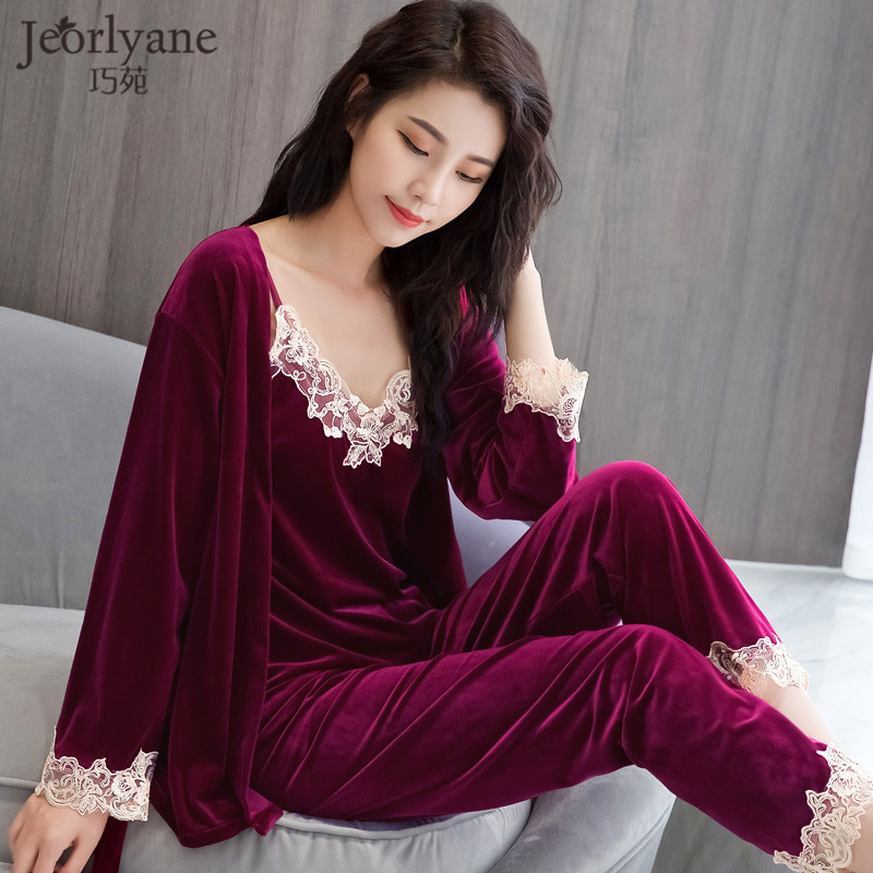 Jeorlyane Chateau Garden Nightgown woman autumn and winter three - piece Golden Velvet Sexy Hanging Roof Home Clothes