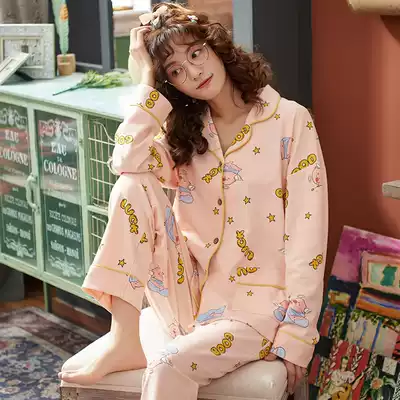 2020 new pajamas cardigan front buckle cotton trousers two-piece suit spring and autumn thin cute can be worn outside