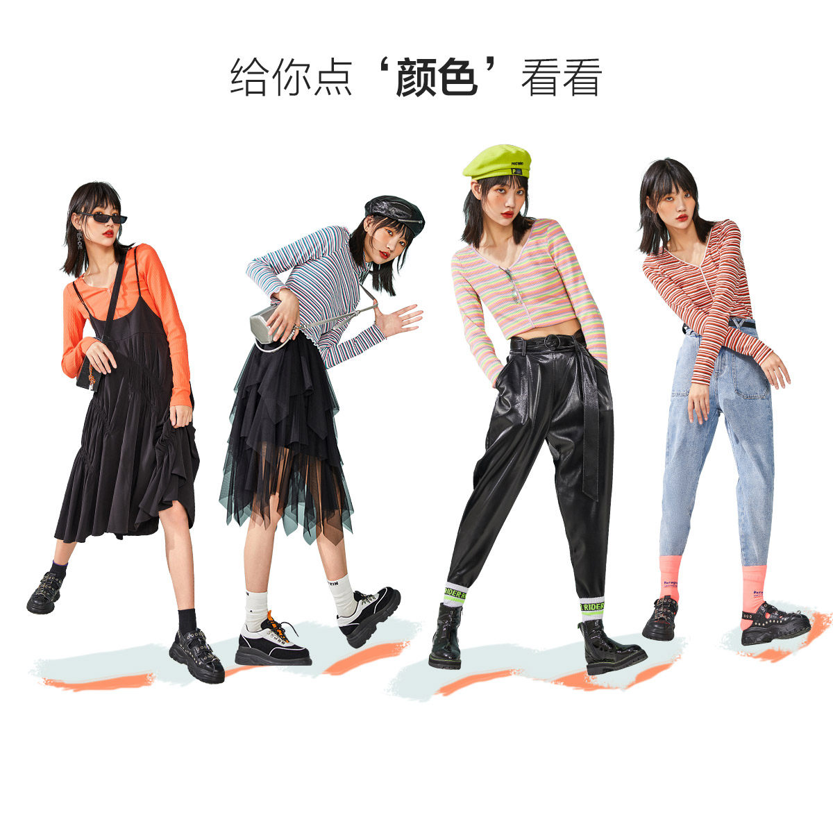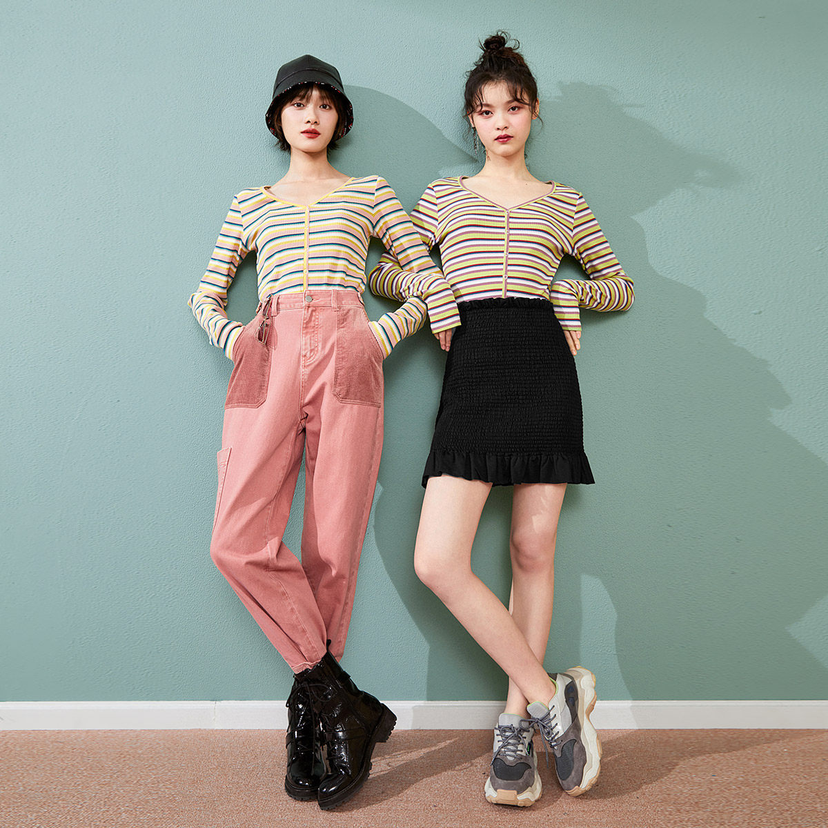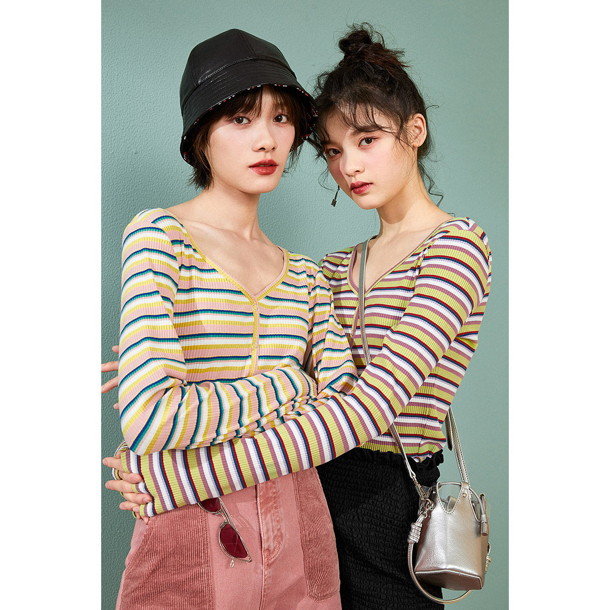 Taiping bird Hyuna wind slim-fit base sweater women's 2019 new autumn and winter V-neck high collar striped long-sleeved T-shirt women