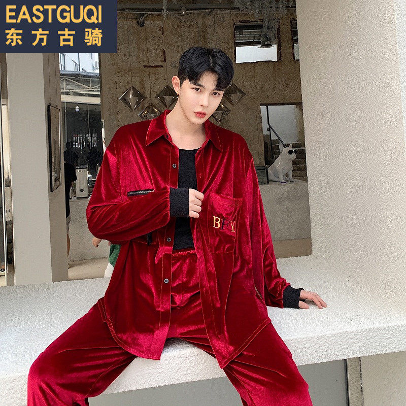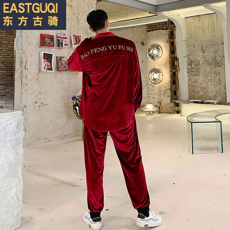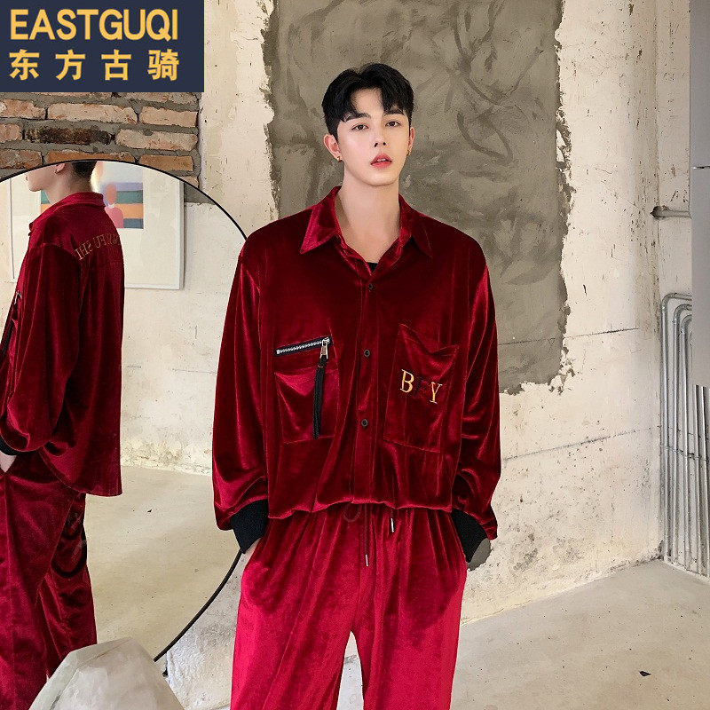 2019 autumn Korean version of slim corduroy shirt men's casual suit young hair stylist shirt two-piece set trend