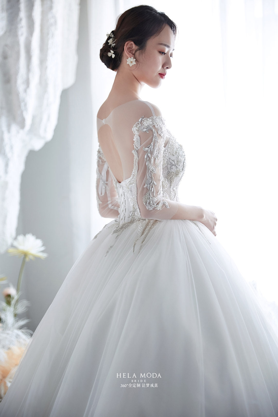 Hera customized 2022 new embroidery court heavy industry long-sleeved backless French luxury main wedding dress with tail bride