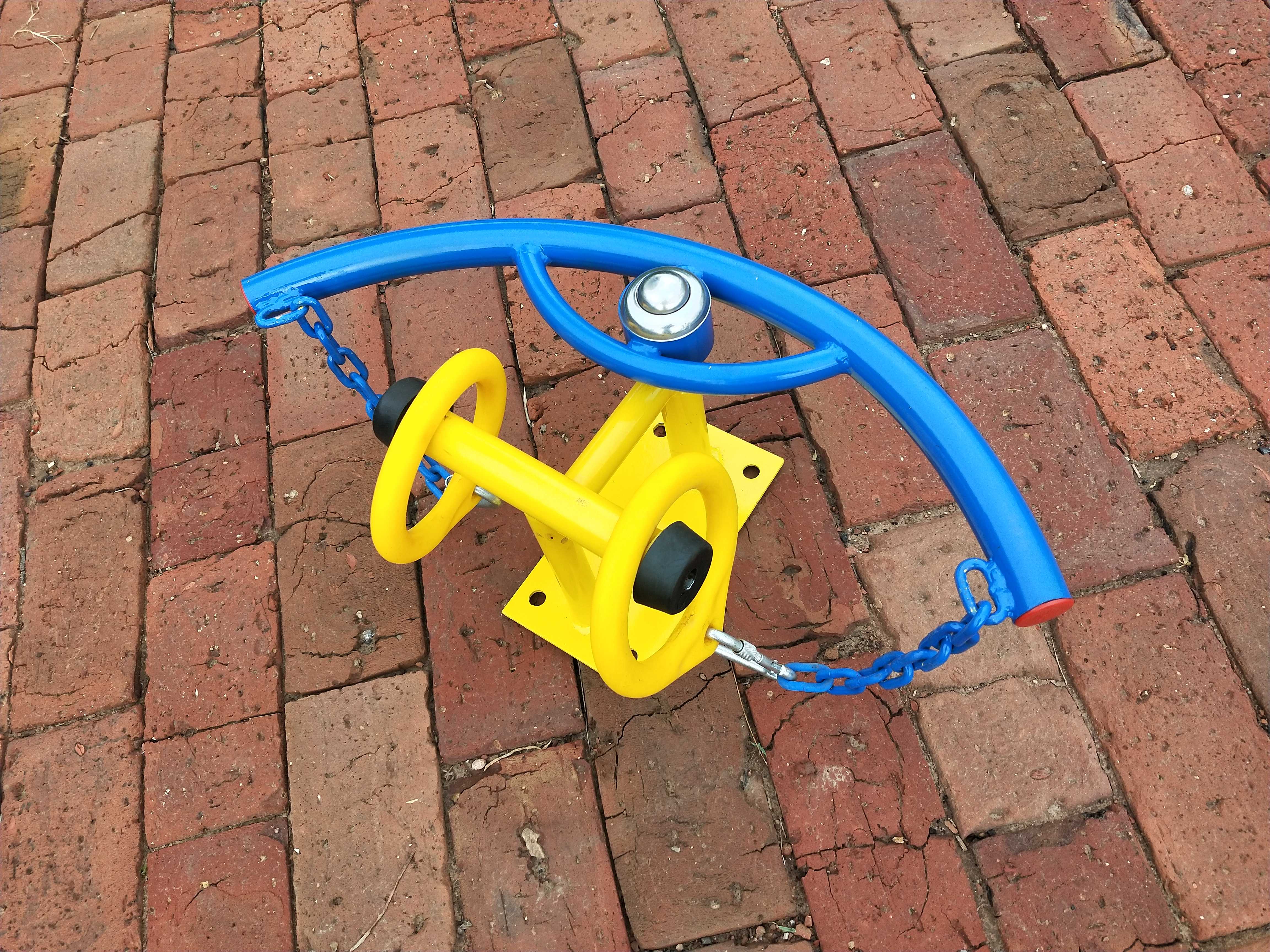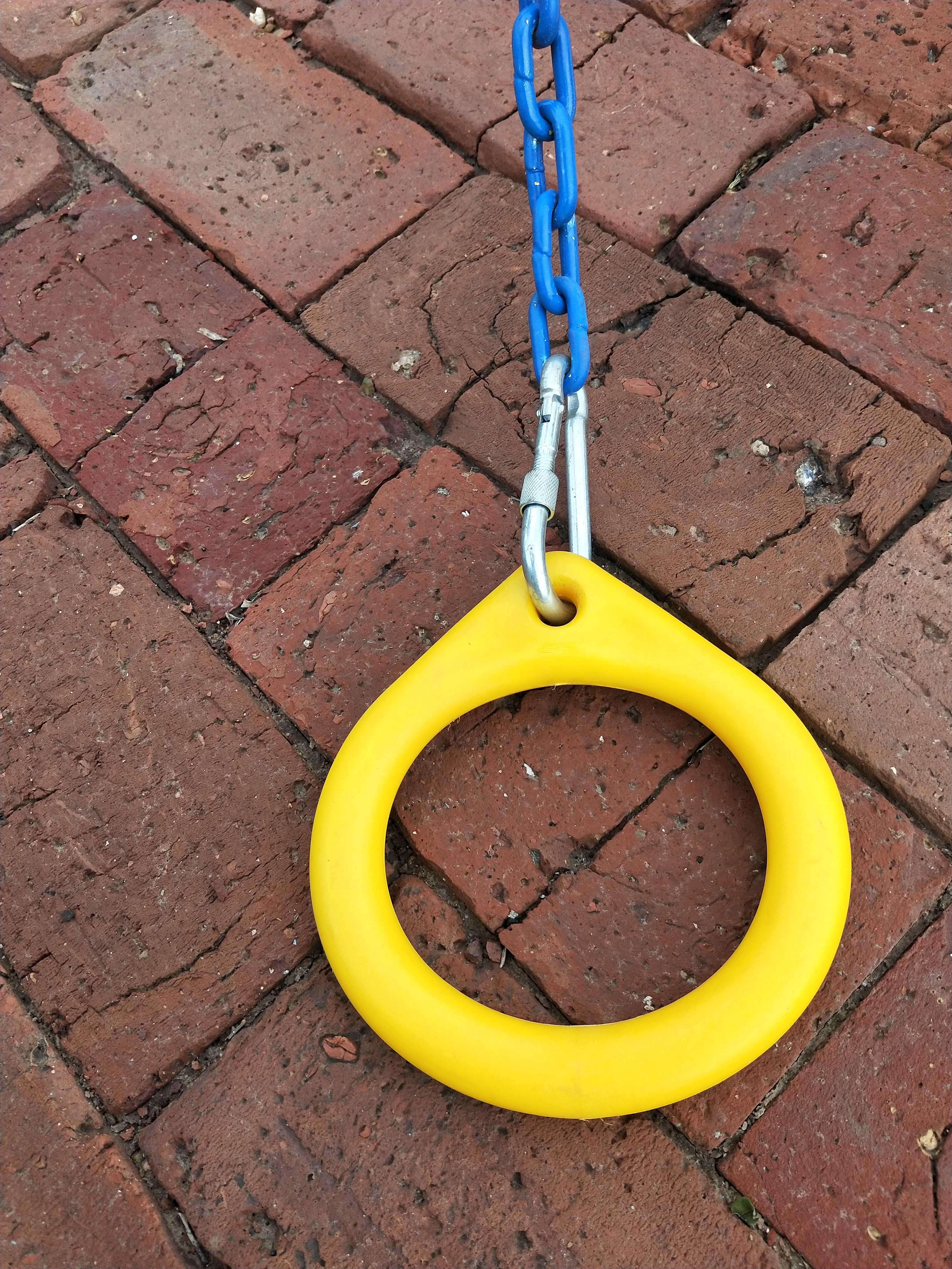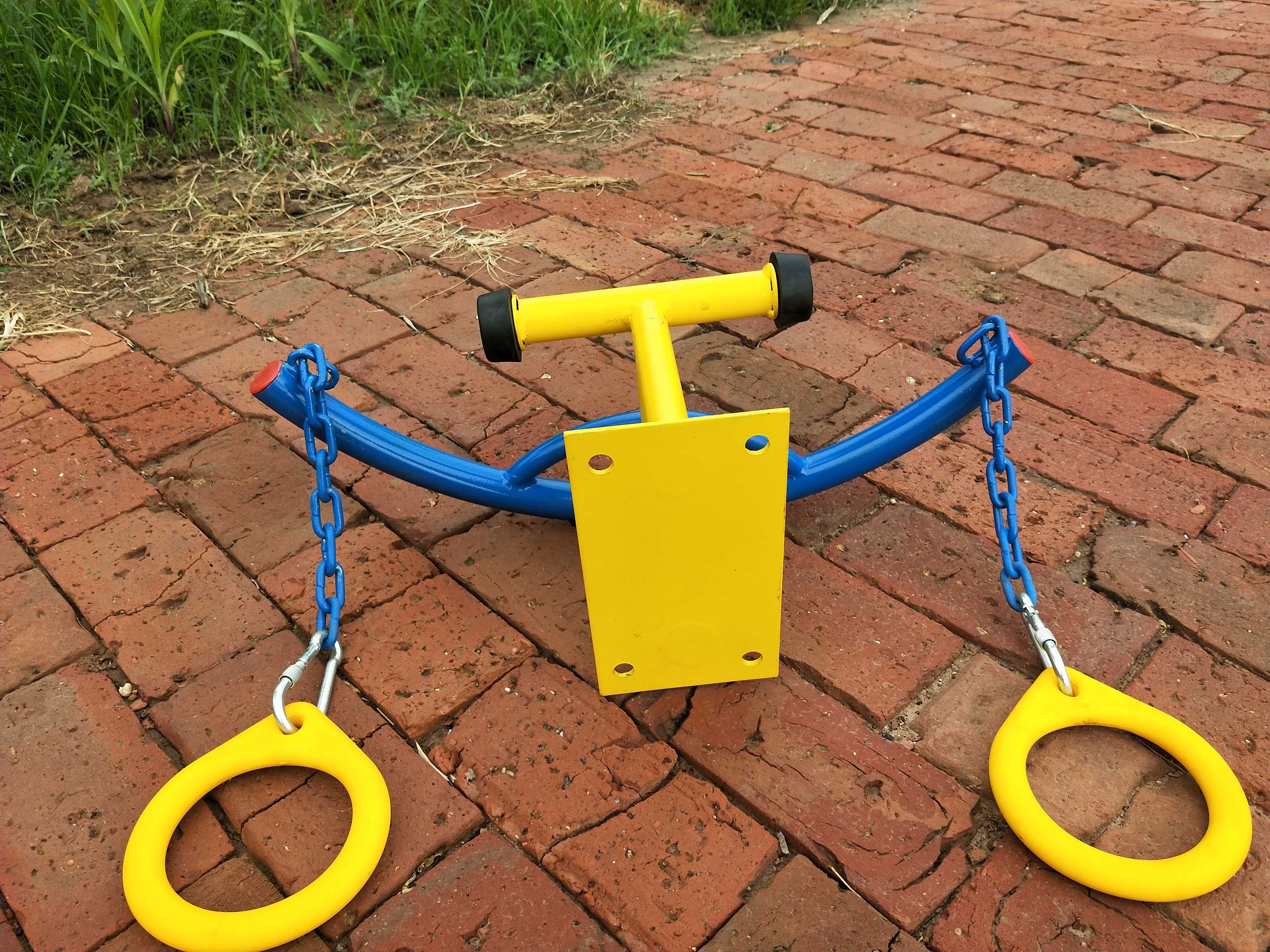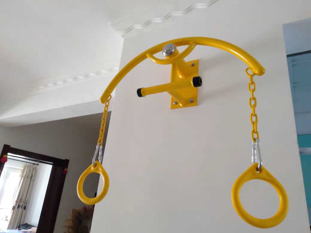 One golden wall upper limb traction device (ring handle) one yellow wall upper limb traction device (straight handle) one blue and yellow wall upper limb traction device (ring handle)