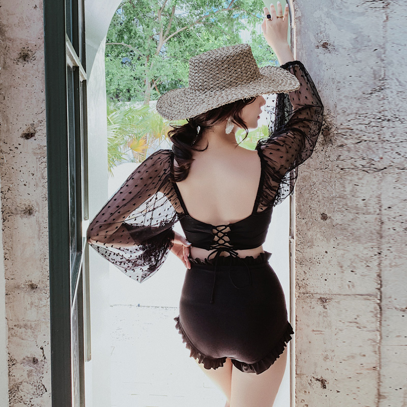Korea ins two-piece swimsuit female fairy fan sexy two-piece set high waist belly thin bubble sleeve hot spring swimsuit