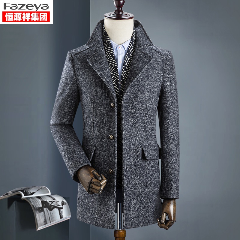 Hengyuan Xiangcai wool coat Men's autumn and winter thickened Ni Zi medium and long version of Ni Zi trench coat Middle-aged Ni Zi jacket