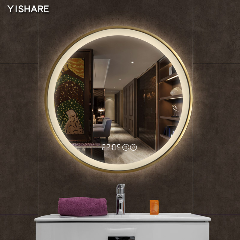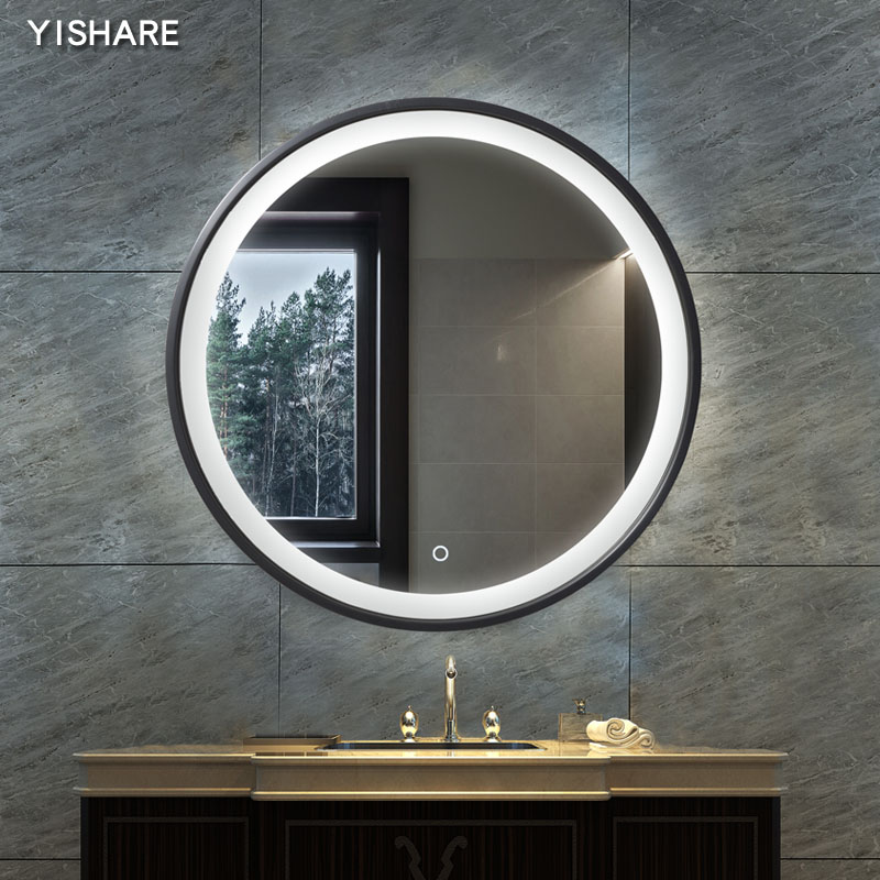Yishare Nordic wall-mounted round with lamp makeup room mirror hanging wall led smart bathroom mirror stainless steel rims