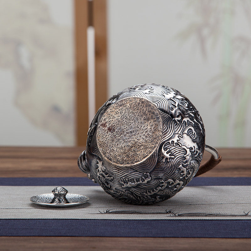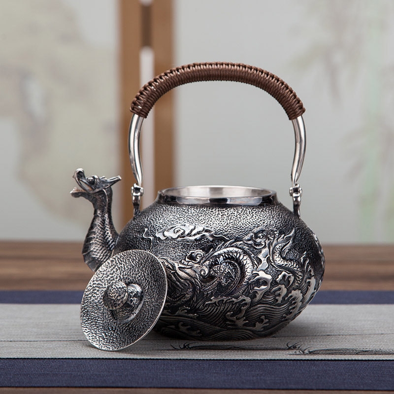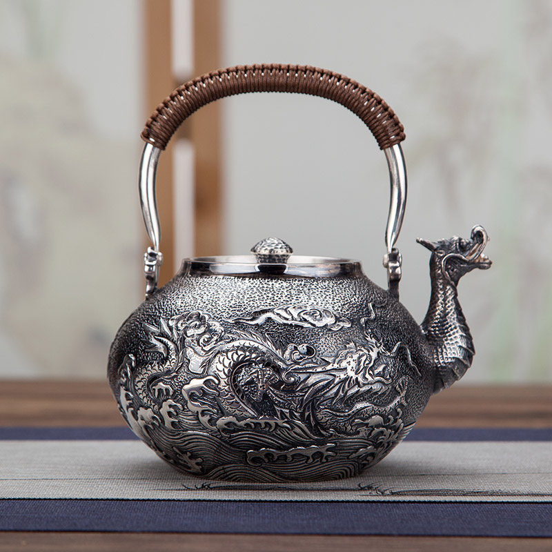 Japanese silver kettle 999 pure silver teapot household tea ceremony cooking tea old silver pot pure hand - made double dragon bead