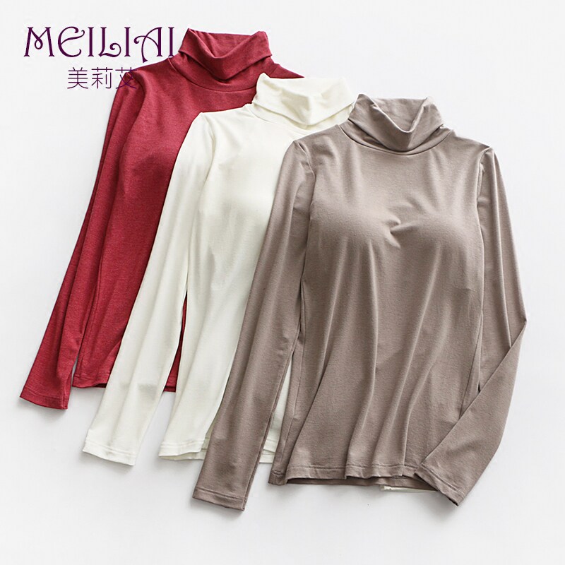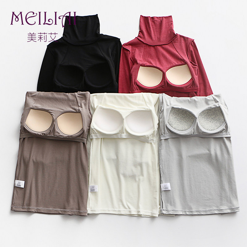 Mid and high collar ladies heat clothes outer wear with chest pad autumn clothes thin section long sleeve inner wear free wear bra top winter