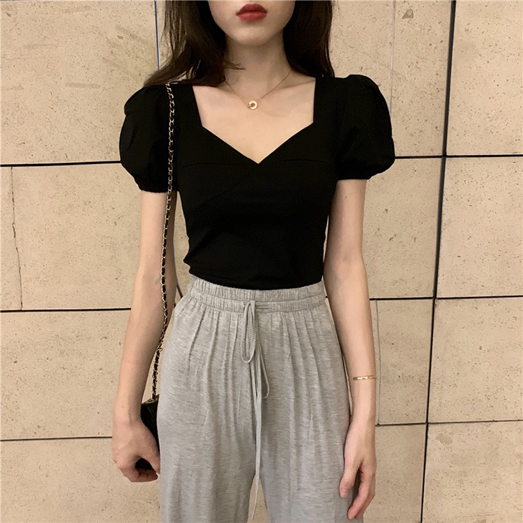 2022 autumn new slim fit and thin short V-neck T-shirt scheming exposed collarbone avocado green puff sleeve top women's