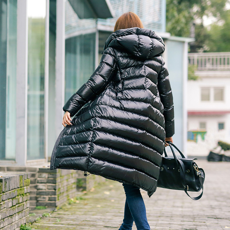 Feather 95% white duck down~thin cocoon type long version over the knee black glossy thickened down jacket female hooded