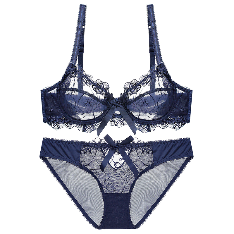 Underwear women's thin lace ultra-thin sexy big breasts show small gather bra set brand counter without sponge