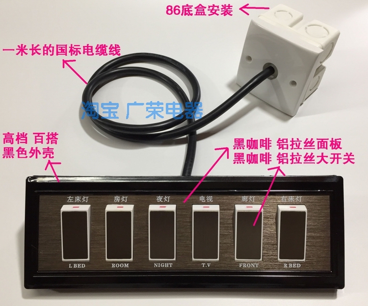 Black coffee six-switch desktop mobile surface-mounted hotel hotel bedside cabinet collector control board connected conjoined switch