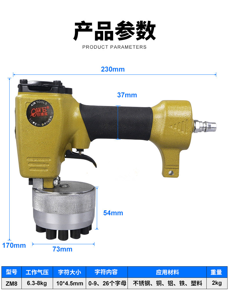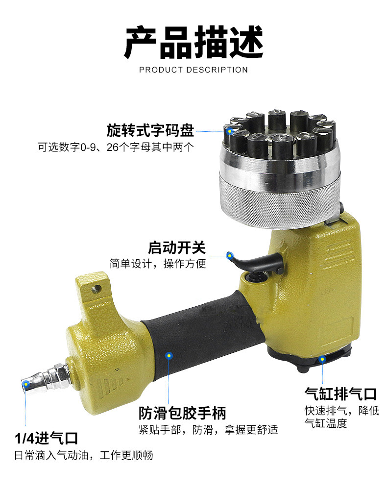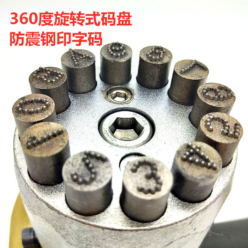 Pneumatic character code stamping machine with 12 characters, one large character size (the buyer's optional), one small character (the buyer's optional), one shockproof small character (the buyer's optional) one shockproof large character