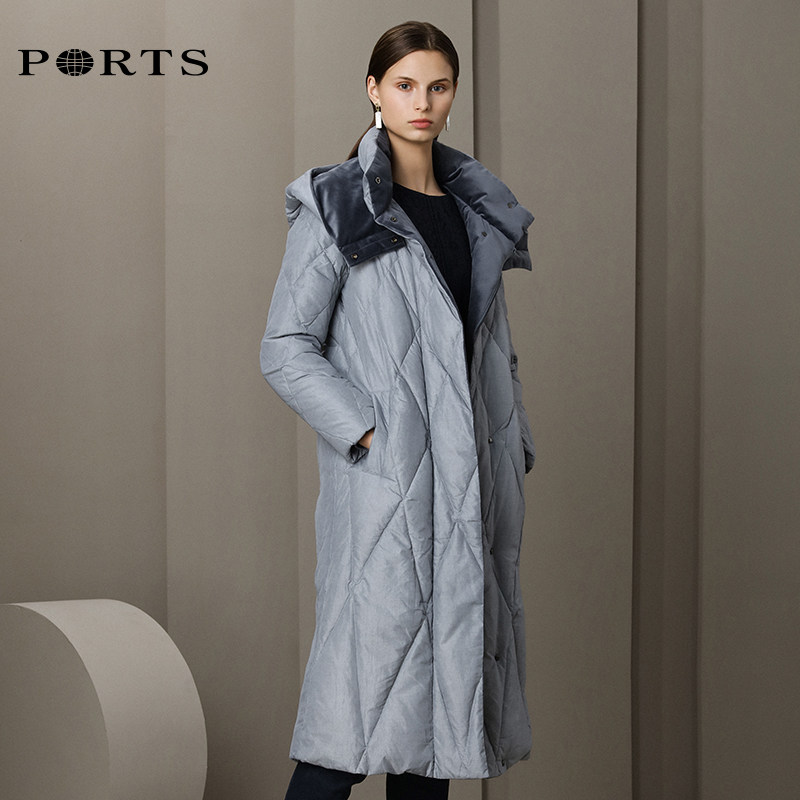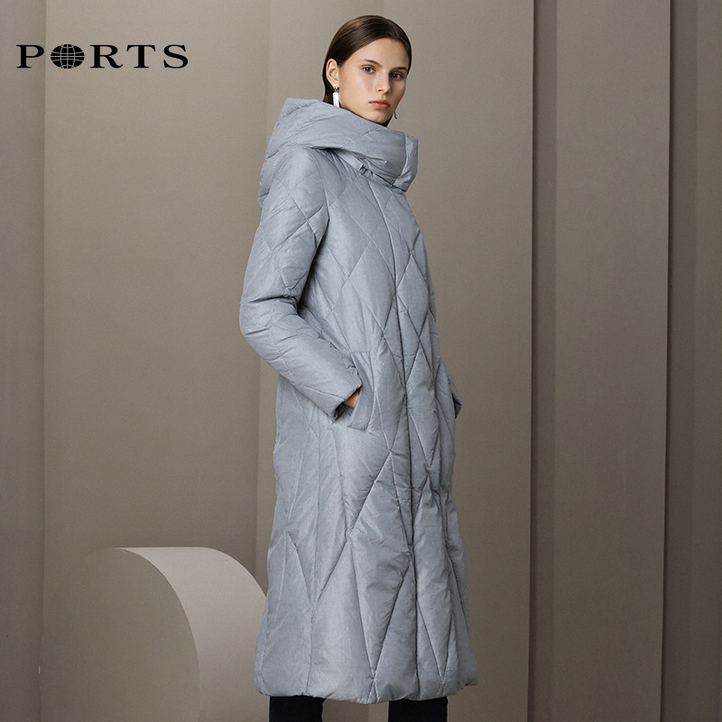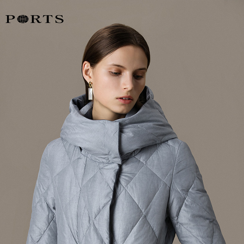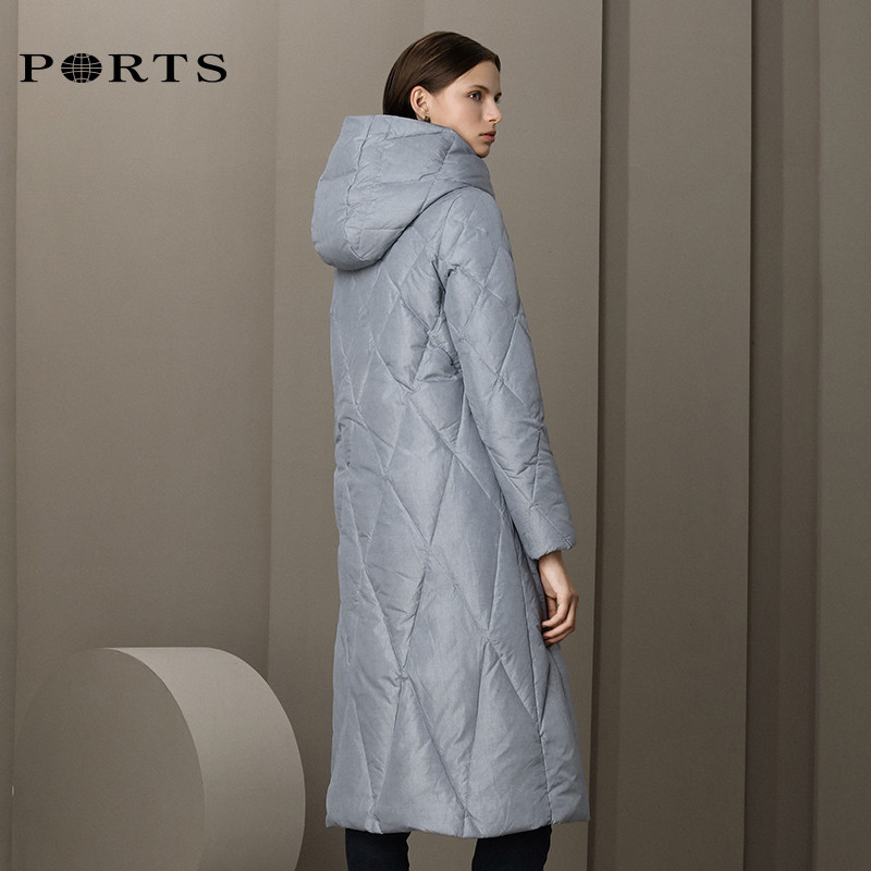 PORTS Baozi 19 women's simple Ling check white duck down hooded mid-length down jacket ALN9U038JZP045