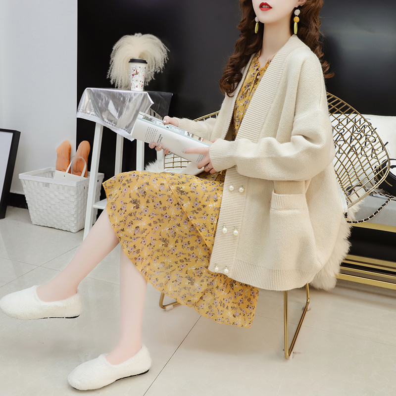 Small fresh sweater cardigan women's mid-length version 2021 autumn new Korean version loose and very fairy knitted jacket spring and autumn