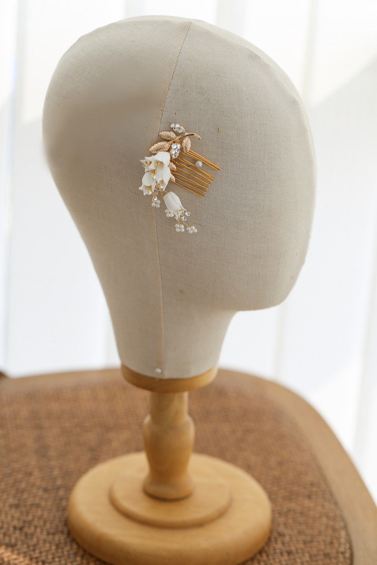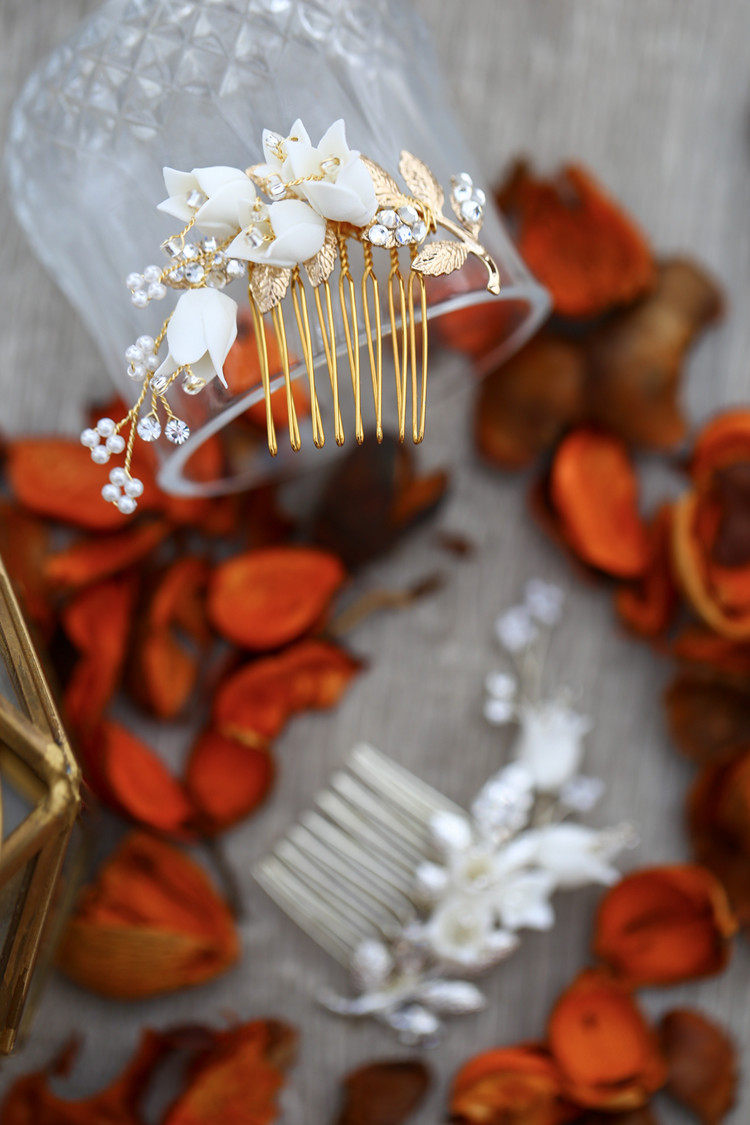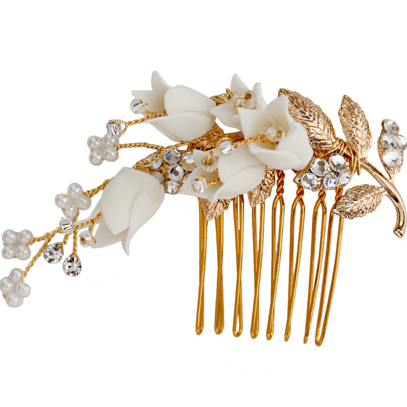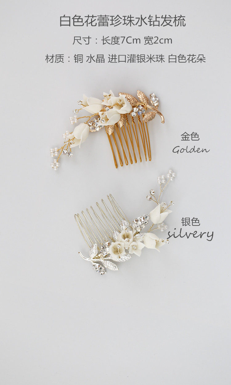 European and American vintage white gold silver pearl handmade white flower leaf Rhinestone Bridal hair ornament styling comb