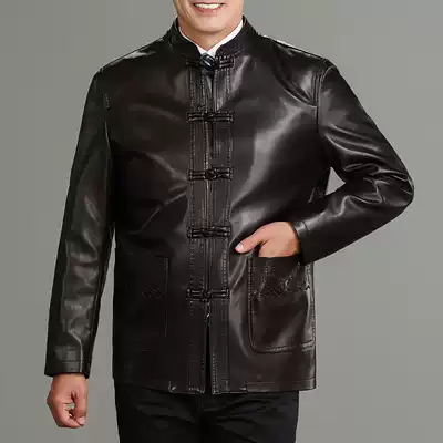Haining middle-aged men's leather jacket men's middle-aged leather jacket loose large size father's embroidery Tang suit