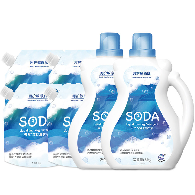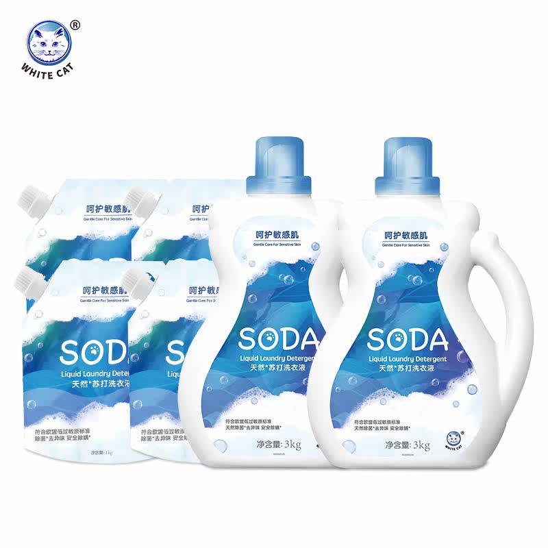 White cat natural soda laundry detergent 3kg * 2 bottles 1kg * 4 bags safe to remove the mites to remove the smell without irritation