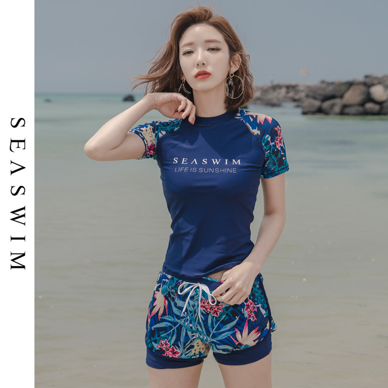 Sunscreen sports swimsuit woman two-piece short sleeve blouse with chest cushion spa swimsuit conserved with conservative and slim cover 4-corner pants