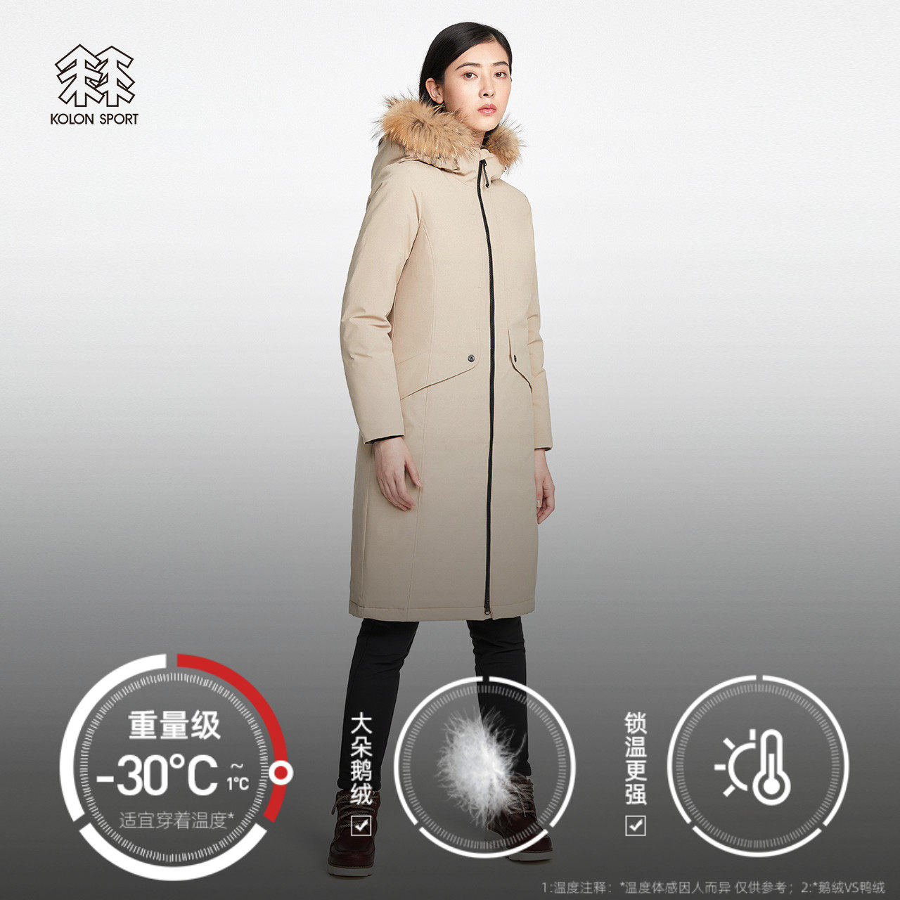 KOLONSPORT Kolong down jacket women's autumn and winter long version of raccoon fur collar goose down down jacket thick coat