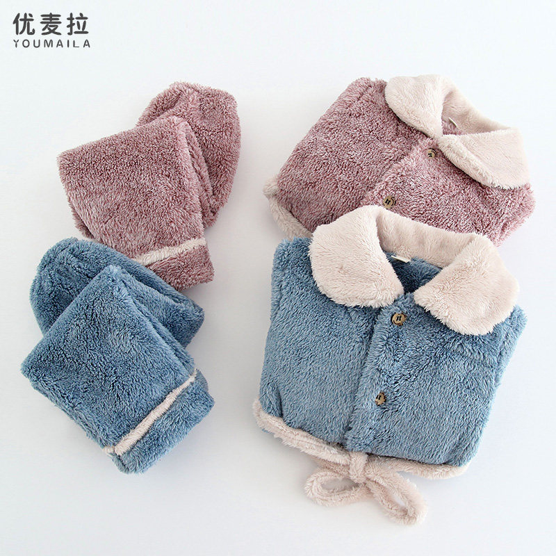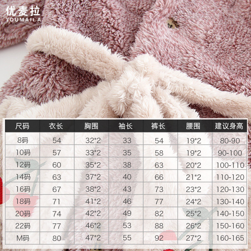 Autumn and winter children's flannel pajamas set thickened cationic mid-length girls' coral fleece home clothes for big children