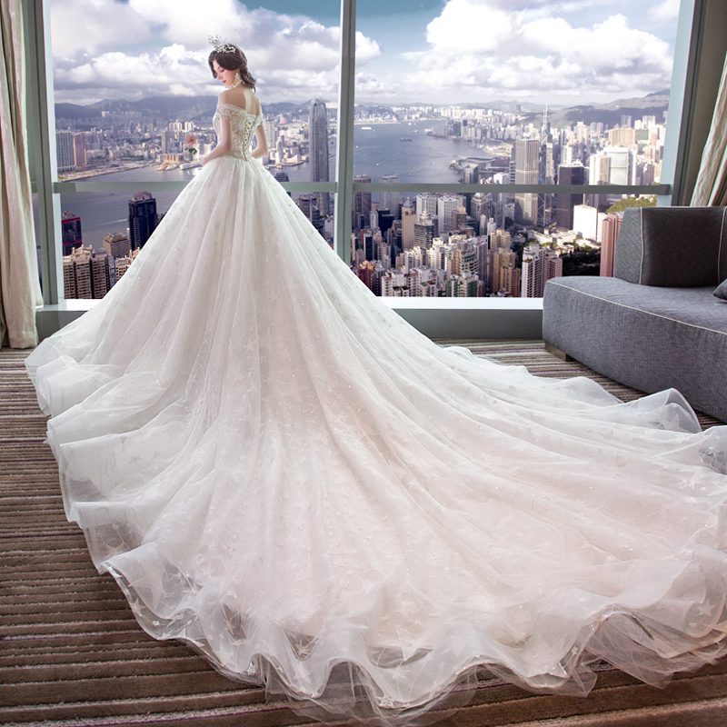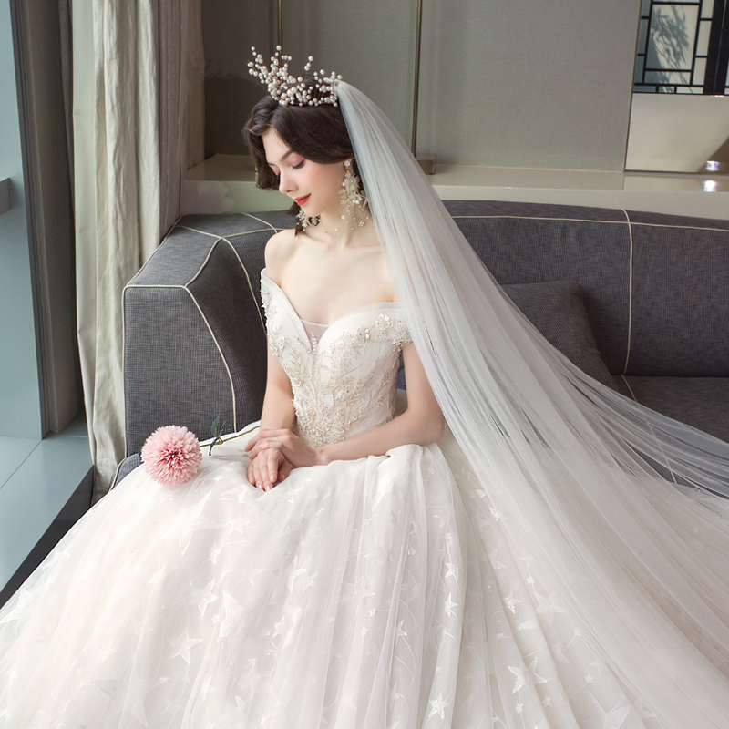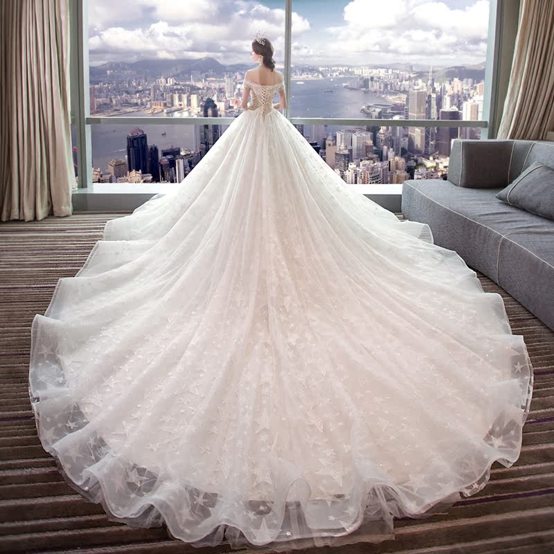 Light wedding dress 2020 new bride starry sky simple word shoulder luxury tail forest department super fairy dream luxury luxury